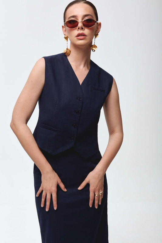 Navy blue linen set with vest and skirt